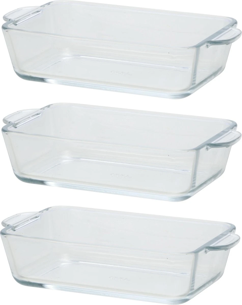 Aantal ovenschalen: 3x. Formaat: 19,6 x 11,3 x 4,5 cm. Inhoud: 500 ml. Materiaal: Borosilicaat glas. Hittebestendig tot 500 graden Celcius. Geschikt voor in de vriezer: Ja, tot -50 graden Celcius, indien u het voedsel goed afdekt. Er zit geen deksel bij inbegrepen. Vaatwasbestendig: Ja.